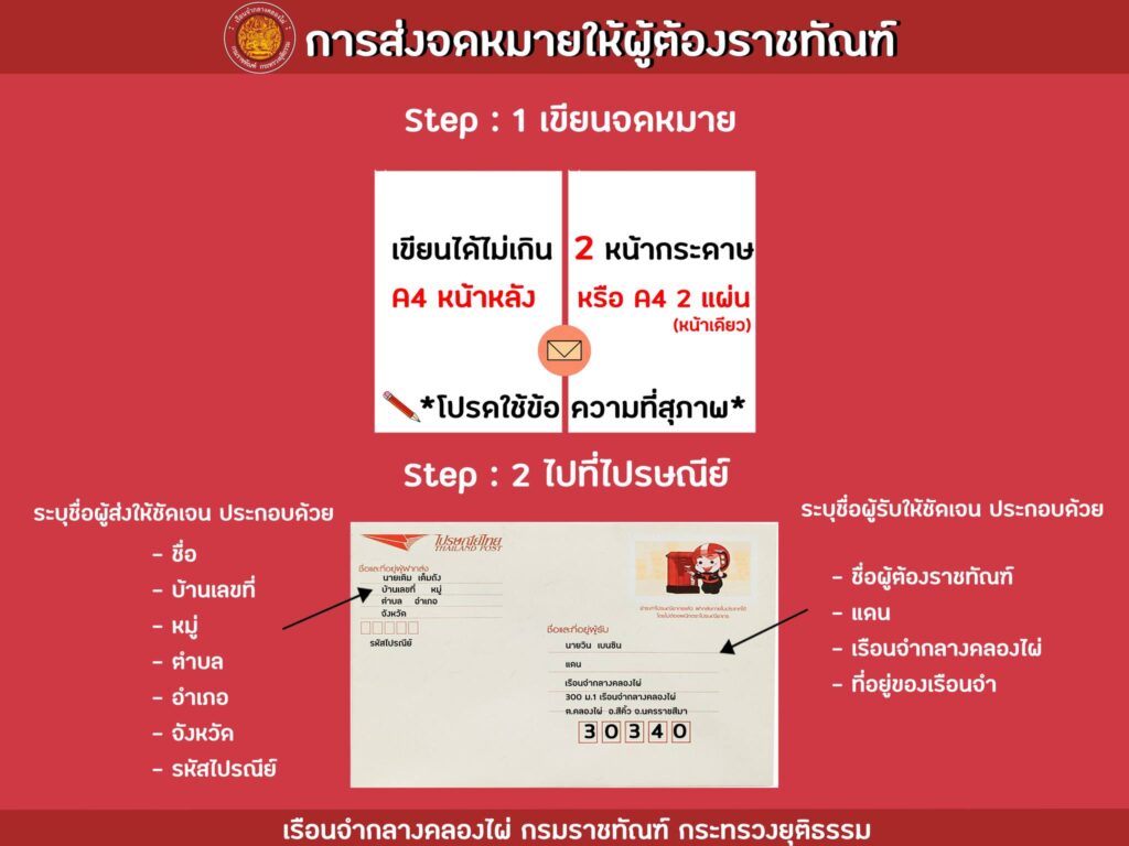 การส่งจดหมายให้ผู้ต้องขัง ญาติสามารถทำได้ 2 แบบ ดังนี้1.การส่งจดหมายแบบปกติ2.การส่งจดหมายออนไลน์